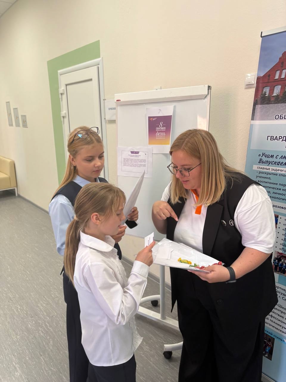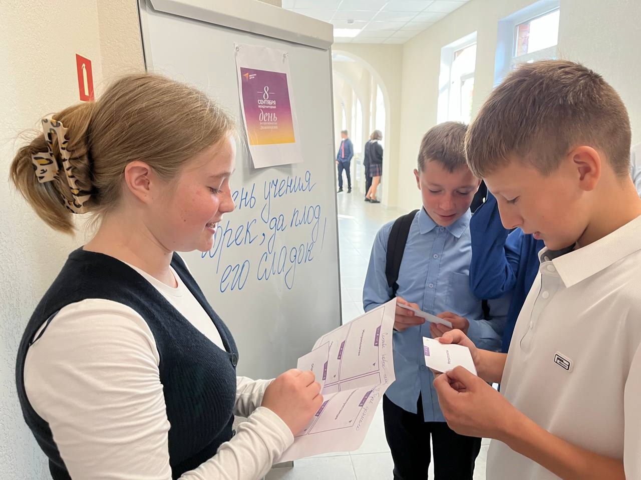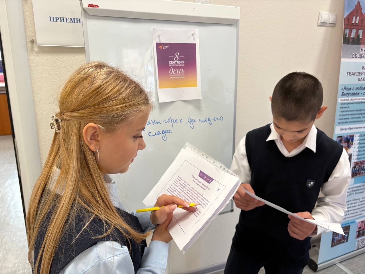 В этот день обучающиеся психолого-педагогического предпрофильного класса провели полезные перемены. Ребята предложили своим ровесникам пройти лингвистический квест, девизом которого стала пословица: "Корень учения горек, да плод его сладок": за правильные ответы ребята получали конфеты.